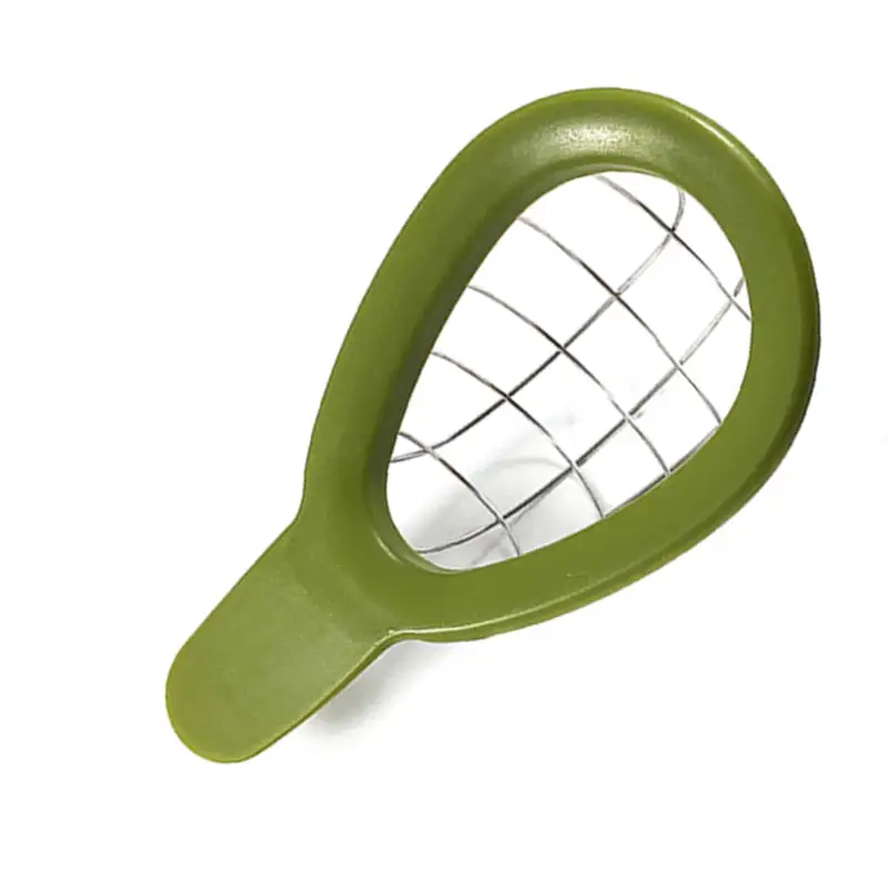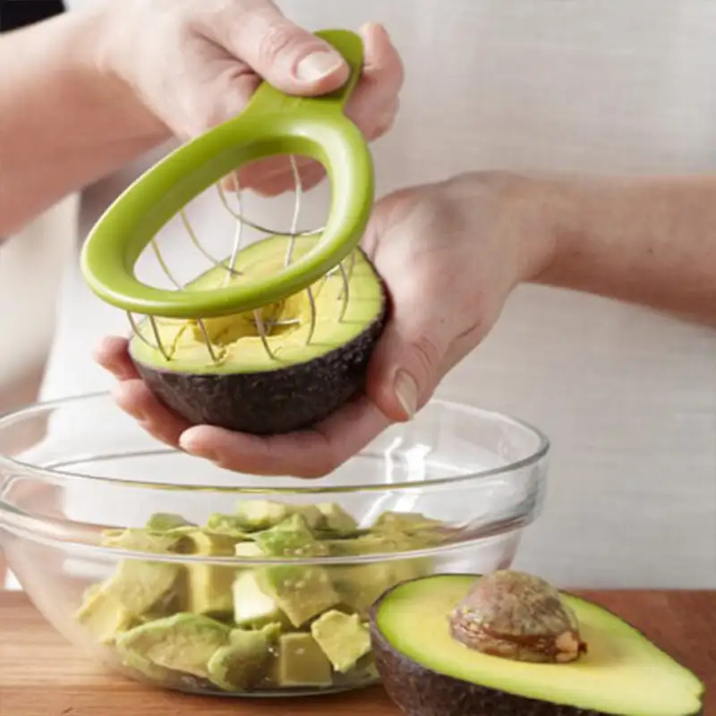Einfach zu bedienen. Eine halbe Avocado ausrichten, nach unten drücken, drehen und hochheben. Stabile Edelstahldrähte schneiden sauber durch das Fleisch.